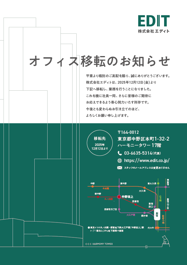 株式会社エディトは、2025年12月12日(金)に事務所を移転いたしました。
